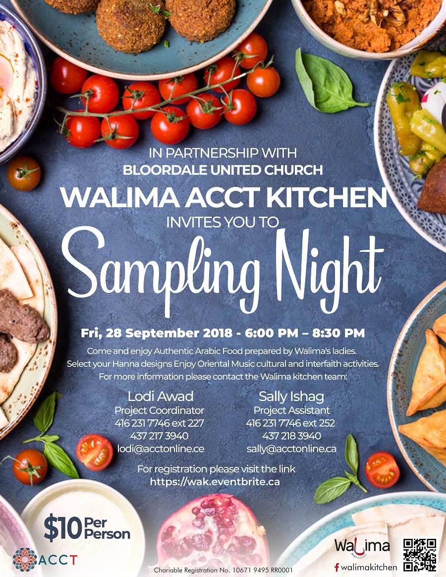 In partnership with Bloordale United Church, Walima ACCT Kitchen invites you to a Sampling Night at Bloordale United Church on Friday Septmber 28, 2018 from 6:00 pm to 8:30 pm.